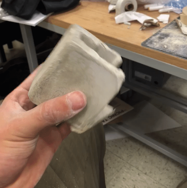 I started the process by making a 3D model of the cement piece. I attempted to make a 3D printed mold which turned out to be inefficient. My second attempt was more successful, this time using a foamboard mold. Next I created a mold for the wood veneer. After pressing and gluing the veneer, I used a piece of steel plasma, backed with grippy material. Finally, I put everything together with clear epoxy.